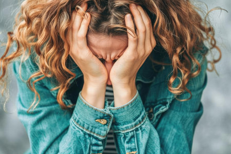 Close-up portrait of a woman with curly hair, displaying emotions of stress and anxiety. She holds her head in hands against a neutral backdrop, illustrating vulnerability.