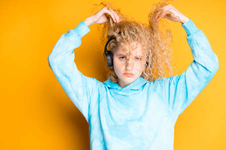 Beautiful girl with curly hair lifts her hair up listening to music on headphones on a bright background