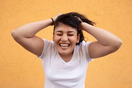 Young woman 20 years old latin brunette fat woman suffers from headache due to illness