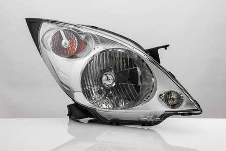 modern automotive headlight with reflection isolated on light background