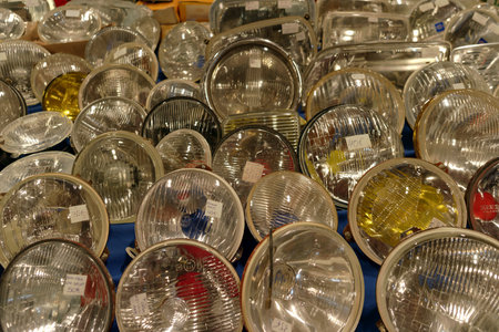 A variety of vintage car headlights are arranged for sale at a local market during autumn. They are shiny and reflect the light, attracting the attention of passengersby.