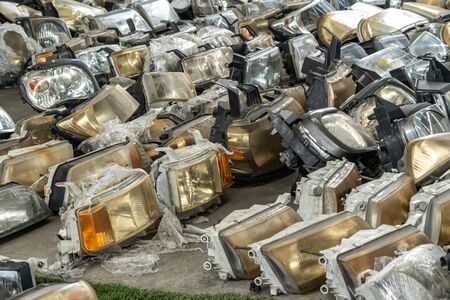 Used headlamp components for sale at scrapyard area