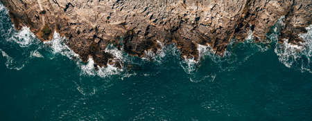 Dramatic marine background. Rocky coast of the Adriatic Sea. White foamy waves beat against the stone shore. Panorama of the sea coast. Aerial top view.