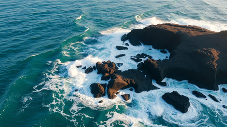 AI Generated. Aerial view of the ocean meeting the rocky coastline