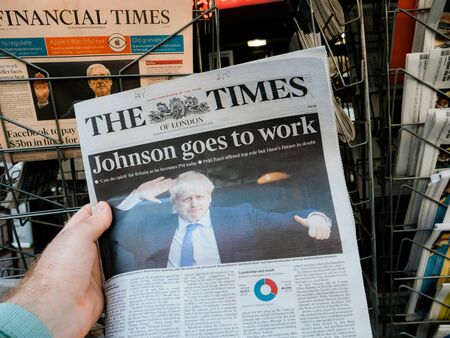 Paris, France - Jul 24, 2019: Boris Johnson appears on cover page of the British The Times newspaper as he becomes UK United Kingdom Prime Minister