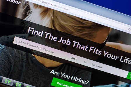 Ryazan, Russia - April 29, 2018: Homepage of Glassdoor website on the display of PC, url - Glassdoor.com