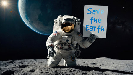 portrait of astronaut with helmet and spacesuit on the surface of the moon showing a sign in favor of saving planet earth - ai generative image