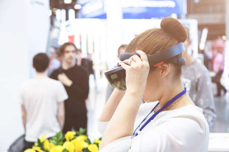 A young woman uses virtual reality glasses
