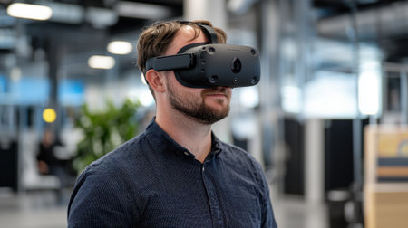 A man is immersed in a virtual reality experience in a contemporary office setting. The bright space features modern design elements and greenery, enhancing the immersive activity.