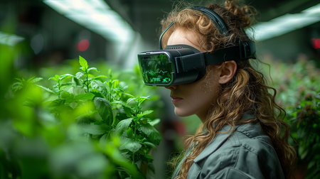 Young woman wearing virtual reality goggles in a greenhouse, looking at plants