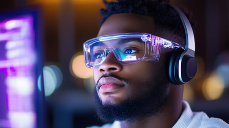 Close-up of a man wearing transparent smart glasses and headphones illuminated by colorful lights, focusing on a computer screen. Futuristic technology and innovation.