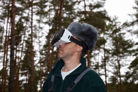 Mushroom picker and virtual reality. A man wearing virtual reality glasses in the forest near a campfire.