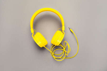 Stylish wired stereo headphones on yellow background. Music lover. Gadgets. Top view.