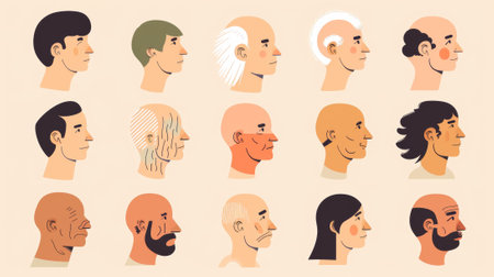 A set of illustrations showing different types and styles of mens hair, AI