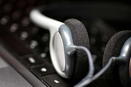 headphones on laptop keyboard concept remote work, distance education