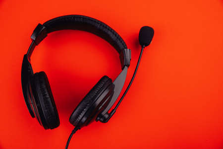 Call center and home office concept. Customer service support, help desk, communication. Headset black on red background, top view, copy space, banner