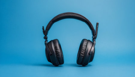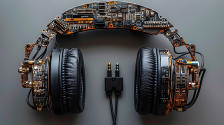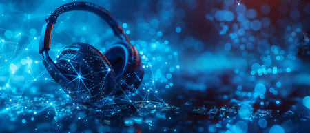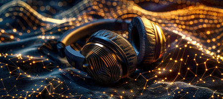 Pair of stylish black headphones placed on a digital abstract background, symbolizing modern technology and sound innovation. Perfect for music lovers and tech enthusiasts.