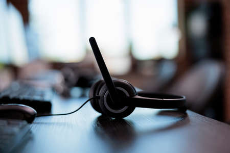 close up soft focus headphone call centre hotline at computer office help desk for background concept