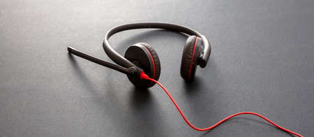 Call center and home office concept. Customer service support, help desk, communication. Headset black with red details on black background, copy space