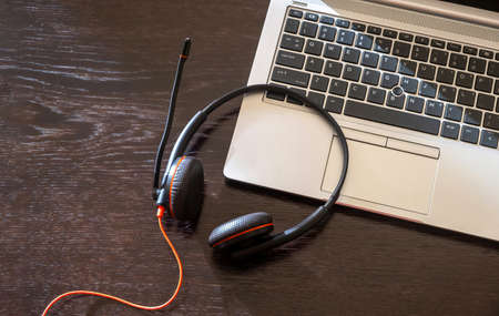 Headset on a laptop, wooden table, view from above, copy space, Call center, home office, customer support, help desk