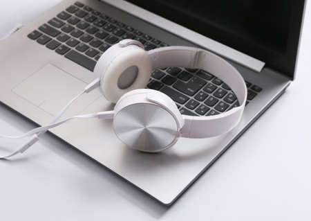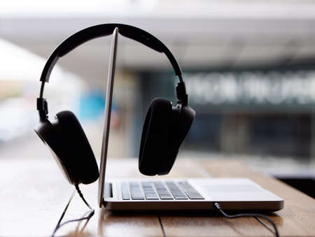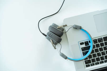 Modern wired headphone left on laptop computer with copyspace. Headphones on the personal notebook computer. Modern audio recording studio and online radio station. Audio live steaming equipment.