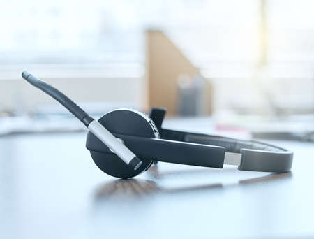 Ready to take your call. Shot of a set of headsets lying on a desk in an empty office during the day.