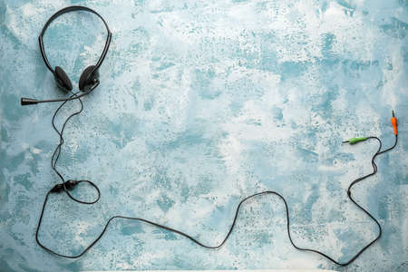 Headphones with microphone on color background