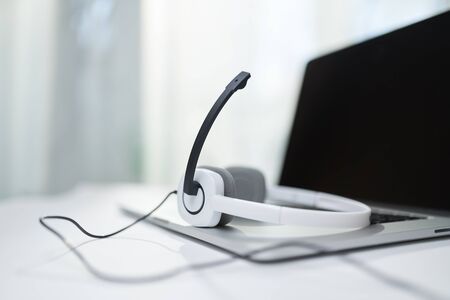 Close-up of laptop, white headphones with microphone on table. Call center support