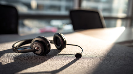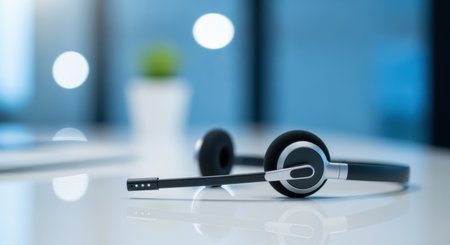 Modern wireless headset resting on a glossy office desk in a bright workspace, symbolizing communication and customer service technology.
