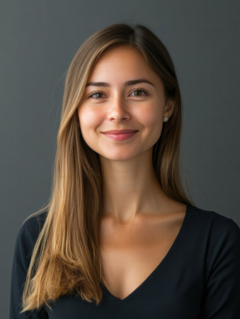 Portrait of young woman. Classic portrait in positive mood, beautiful model posing in studio over plain background looking at camera