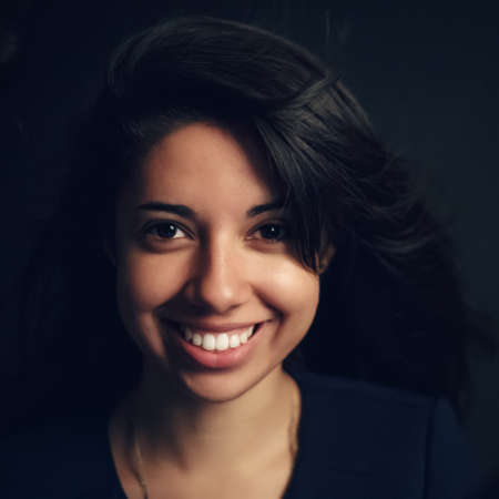 Portrait of beautiful smiling Hispanic latino girl woman with dark brown eyes long dark hair in white shirt posing in studio on dark black background looking in camera