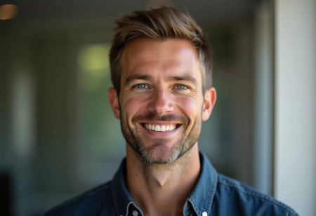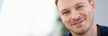Handsome and Smiling Male Face Closeup Portrait. Happy Man with Light Hair and Blue Eyes. Confident Caucasian Person with Positive Emotion. Carefree Unshaven Guy Head and Shoulders Photography