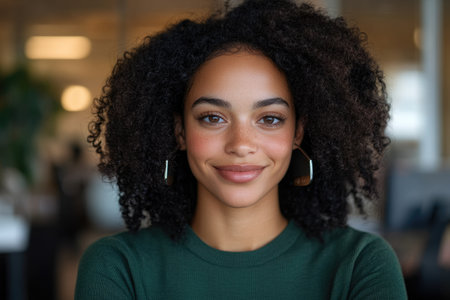 A confident young woman stands by a large window, showcasing her curly hair and natural beauty. The indoor scene offers a modern and bright ambiance, highlighting her serene expression and positive energy.