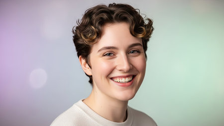 A portrait shows a young woman with short, curly brown hair and a bright smile. She is wearing a light-colored top. The background features a soft, blurred gradient of colors. The image composition, and lighting suggest potential use for promotional or illustrative purposes.