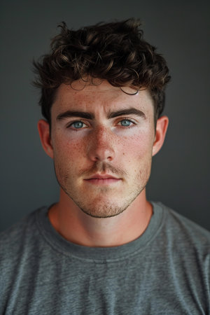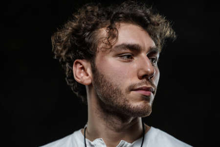 Close-up portrait of a young handsome male model posing on a grey background in a dark studio, wearing white casual shirt and looking interested