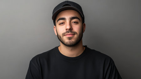 Portrait of a young man with a beard and cap, exuding confidence and style against a gray backdrop. Ideal for use in fashion, lifestyle, and personal branding projects.