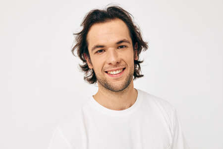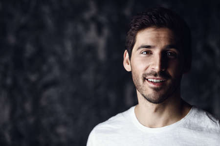 Portrait of a handsome smiling young man wearing white t-shirt. Studio shot over dark background. Men's beauty and health.