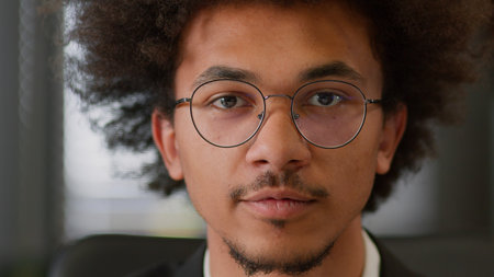 Portrait close up headshot indoors African American ethnic business man businessman guy male employer entrepreneur student manager leader work at office working studying serious calm looking at camera