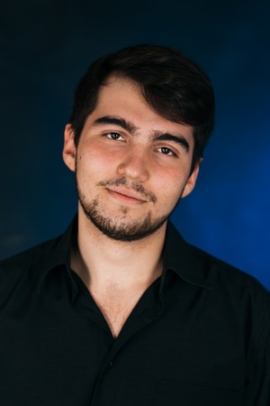 A close-up portrait of a young man with curly hair and a warm smile, set against a calming blue backdrop. His expressive eyes and friendly demeanor radiate positivity and approachability, inviting connection and warmth.