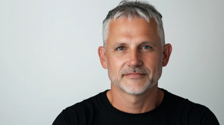 Close up of mature man with white skin, grey short hair, wavy hair and a clear black t shirt, isolated in a light white studio. Portrait person.