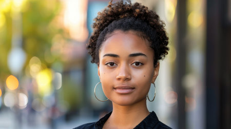 A young woman with short, curly hair stands in front of a blurred background of an urban city, looking directly at the camera with a neutral expression. She is wearing a black shirt and hoop earrings. The light from the sun shines behind her, creating a soft glow around her.