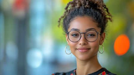 Woman with curly hair and glasses smiles confidently in a vibrant outdoor setting filled with natural light.