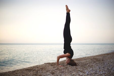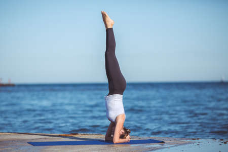Young fitness woman doing yoga exercises standing on her head on a gymnastic mat at the beach
