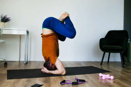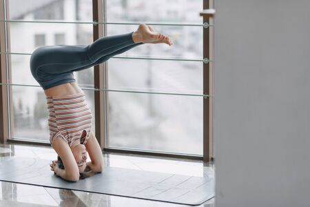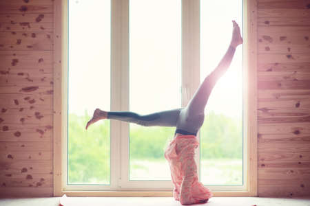 A girl practices yoga doing a headstand pose on the floor in a room in the morning. Healthy lifestyle, workout, indoor full length. high quality photo