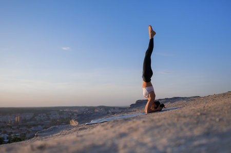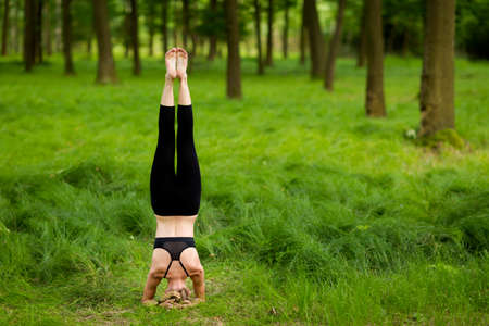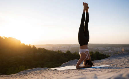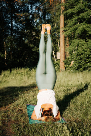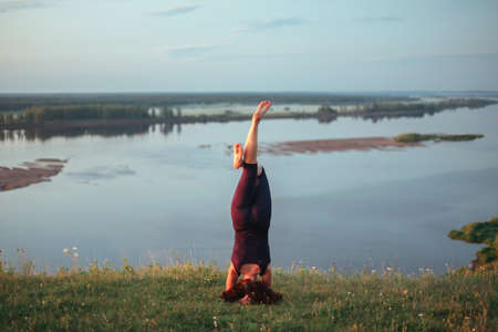 Young beautiful Caucasian woman doing headstand yoga pose. Yogi woman doing stretching workout in park outdoors at sunset. Healthy lifestyle modern activity