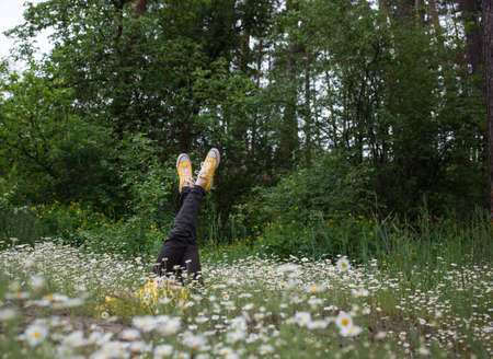 woman lifted up her legs in black jeans and yellow sneakers, lies among a field with chamomile flowers. Rest in a forest blooming meadow. Enjoy the happy moment