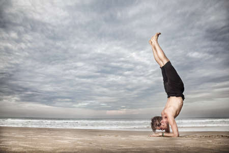 Tattoo man doing high level yoga asana on the beach at sunset. Head stand exercise.