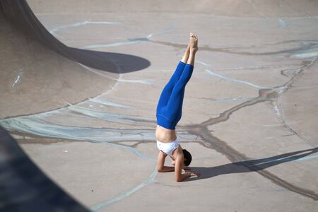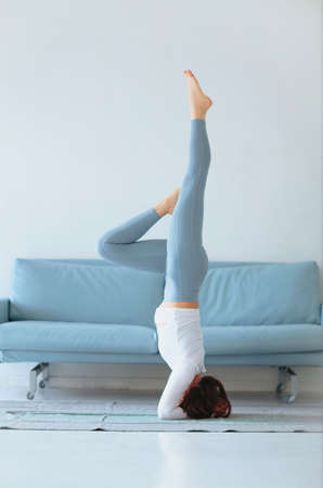 Beautiful young caucasian girl doing yoga and performing a headstand