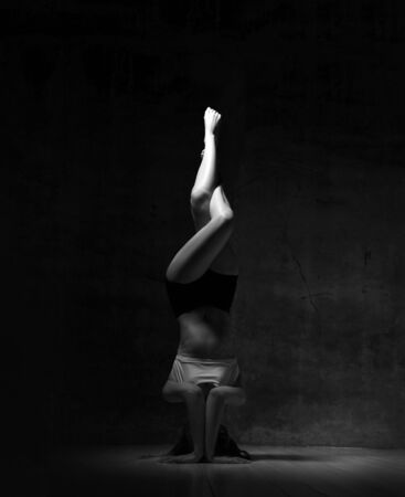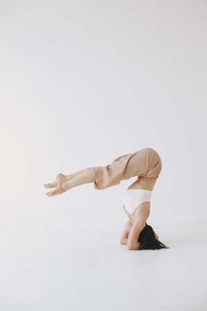 Beautiful brunette woman yoga asana gymnastics fitness stands on her head