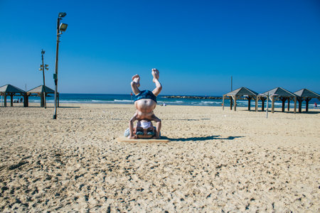 Summer yoga session on a beautiful golden beach - polish Grzybowo village, near to Kolobrzeg. Salamba Sirsasana - supported headstand